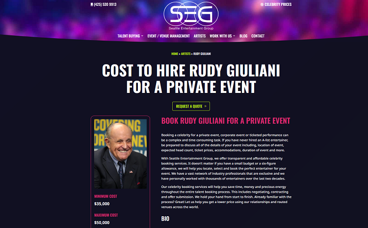 Giuliani je u Banja Luci je boravio dva dana te je čak sudjelovao na mitingu podrške Dodiku zbog izricanja presude Dodiku pred Sudom BiH. Međutim, otkriveno je kako tvrtka Seattle Entertainment Group koja posreduje u organizaciji i ‘iznajmljivanju’ sudjelovanja javnih osoba, ‘celebrityja’ na ‘eventa’, privatnim i poslovnim događajima. Konkretno za Giulianija, cijena njegovog dolaska na neki događaj kreće se između 70.000 i 100.000 KM (od 35.000 dolara do 50.000 dolara) uz plaćene sve ostale troškove, a cjenovnik njegovog angažmana možete vidjeti OVDJE. Opravdane se sumnja da je Giulianiju upravo na ovaj način dogovoren i plaćen angažman.