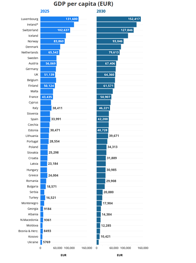 Prema projekcijama, Irska bi do 2030. trebala postati zemlja s najvišim BDP-om po stanovniku prilagođenim za paritet kupovne moći (PKM), preuzevši vodeću poziciju od Luksemburga. Međutim, ovu brojku treba uzeti s velikom rezervom. Na začelju ove ljestvice je Ukrajina, što je očekivano s obzirom na rat koji je ušao u četvrtu godinu rata. Potom slijedi Kosovo, pa BiH, Moldavija, Sjeverna Makedonija, Albanija, Gruzija, Crna Gora, Turska, Srbija…