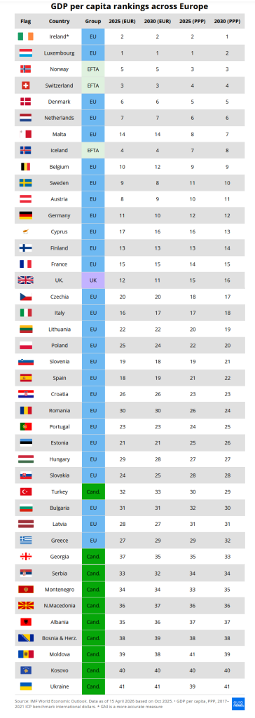 Među 41 europskom zemljom – uključujući članice EU-a, zemlje kandidatkinje, članice EFTA-e i Ujedinjeno Kraljevstvo – predviđa se da će Irska do 2030. godine zauzeti vrh tabele BDP-a po glavi stanovnika PKM-a, istiskujući Luksemburg, koji vodi 2025. godine.