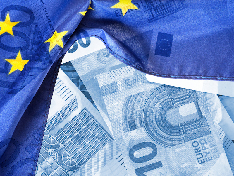 Flag of the European Union EU and euro banknotes