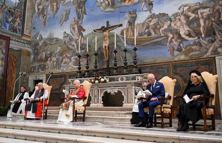 Charles III., vrhovni upravitelj Anglikanske crkve, sjedio je papi slijeva blizu oltara kapele dok su Lav, prvi papa iz Sjedinjenih Država, i anglikanski nadbiskup Stephen Cottrell vodili službu u kojoj su sudjelovali zbor Sikstinske kapele i dva kraljevska zbora.